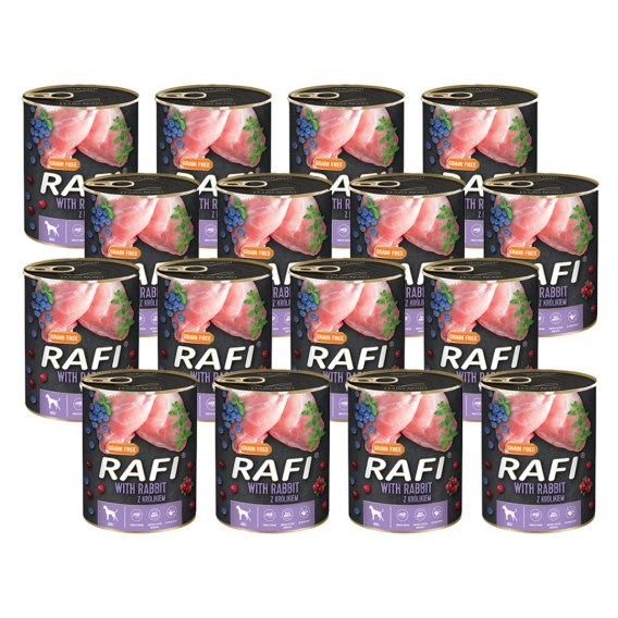 Mokra karma Rafi z królikiem to produkt stworzony w oparciu o nowoczesne normy i zalecenia prawidłowego żywienia dorosłych psów. Jej skład w pełni pokrywa zapotrzebowanie na niezbędne składniki odżywcze, mineralne i witaminy. Mięso i surowce pochodzące z królika, oprócz pełnowartościowego białka, są źródłem żelaza, selenu i cynku biorących udział w pobudzaniu funkcji obronnych organizmu. Karma nie zawiera dodatków substancji konserwujących ani barwników poprawiających smak i stymulujących apetyt. To obecność w składzie borówki, żurawiny i tymianku naturalnie podnosi atrakcyjność sensoryczną posiłku dla psa. Dodatek oleju lnianego bogatego w kwasy tłuszczowe n-3 i n-6, witaminę E oraz substancje o właściwościach przeciwzapalnych, dostarcza także cennych związków biologicznie czynnych - fitosteroli, które korzystnie wpływają na poprawę funkcjonowania przewodu pokarmowego.